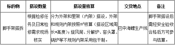 根據(jù)巴中海螺生產(chǎn)經(jīng)營(yíng)需求,為保障回轉(zhuǎn)窯、水泥磨及生產(chǎn)設(shè)備實(shí)施檢修期間的施工安全、質(zhì)量和進(jìn)度受控,部分區(qū)域需搭設(shè)腳手架。為確保腳手架搭設(shè)業(yè)務(wù)開(kāi)展的合規(guī)性,本著公平、公正、公開(kāi)、透明的原則,現(xiàn)將招標(biāo)相關(guān)事宜公告如下: