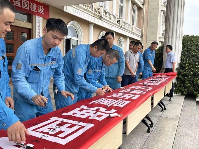 全員動起來,質(zhì)量強起來。9月1日,公司辦公樓前已是人頭攢動。在公司領(lǐng)導班子的帶領(lǐng)下,各部門負責人與員工代表精神抖擻,共同在“加強全面質(zhì)量管理 促進質(zhì)量強國建設(shè)”的橫幅上鄭重簽名承諾。一筆一劃,標志著荻港海螺質(zhì)量月活動隆重開幕。